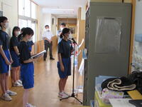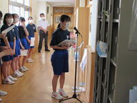 午後からは英語弁論大会、支部駅伝大会、新人陸上大会に出場する代表生徒らの決意表明を聞き、壮行会を開きました。