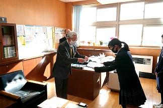 12月18日(金)、本宮市ライオンズクラブから3名の方が来校され、第33回国際平和ポスターコンテストで入賞した生徒2名に賞状が授与されました。