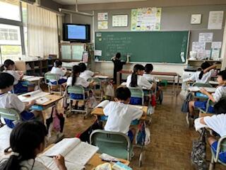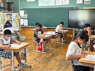 6年生の社会科の授業では、「天皇中心の国づくり」のテストに挑戦です。1学期に学習した内容も思い出しながら、問題文をよく読んで答えを記入します。最後まで真剣に取り組む姿はさすが6年生です。