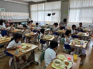 今日のメニューは、ごはん、手作りヒレカツ、千切りキャベツ、ミニトマト、なめこのみそ汁、県産ブルーベリーゼリー、牛乳です。1・2年生のミニトマトは食べやすいように半分に切ってあります。