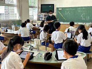 5年生の理科の授業では、「台風と天気の変化」の学習です。「台風はどのように動くのかな?」タブレットを使って、現在発生中の台風10号の発生した日時や動き、勢力などを調べます。