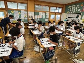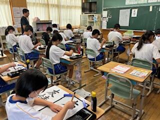 6年生の国語科(書写)の授業では、「用紙に合った文字の大きさと配列」の学習です。漢字の大きさやバランスを考えながら、「友情」の毛筆に挑戦します。シーンと静かな教室で集中して取り組みます。