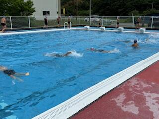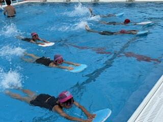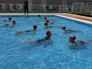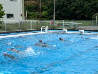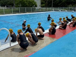 先週は、主に水に慣れることを中心に取り組んできましたが、今週からはそれぞれの学年に応じて、水の中をワニ泳ぎで進んだり、ビート板で泳いだり、クロールの練習をしたり、一人一人が一生懸命に取り組んでいます。