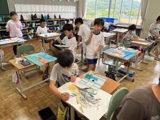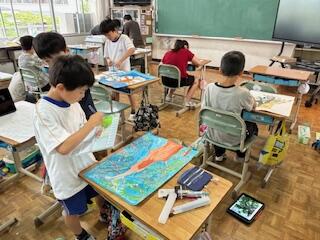 4年生の図画工作科の授業では、「木々を見つめて」の学習です。自分でお気に入りの木の入った風景を描きます。葉っぱ1枚1枚を丁寧にかいたり、構図を工夫したりしながら制作します。