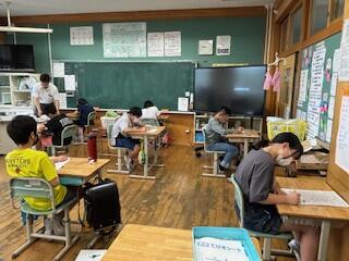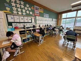 6年生の家庭科の授業では、「できることを増やしてクッキング」のテストです。調理実習でつくった三色野菜いためや朝食の役割について、これまで学習したことを確認します。