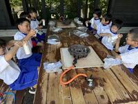 みんなでバターづくり体験をした後、クラッカーにバターをつけて試食。