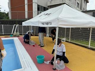 大プール、小プールの清掃は1日(土)にPTA本部役員と地域の皆さんできれいにしていただき、今日は更衣室やトイレ、プール周りの除草作業を行いました。
