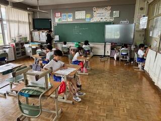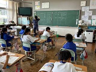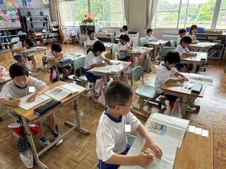 2年生の国語科の授業では、「かん字のたしかめ」の学習です。2年生になって新しく学習した漢字について、「とめ」「はね」「はらい」に注意して丁寧に漢字を書きます。