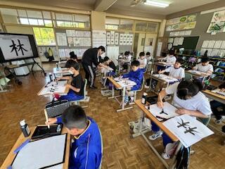 4年生の国語科(書写)の授業では、「部分の組み立て方(左右)」の学習です。「左側の『木』と右側の『木』のバランスは?」左右の組み立てに注意して「林」を練習します。