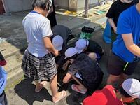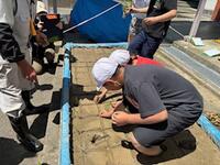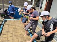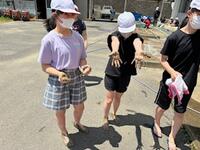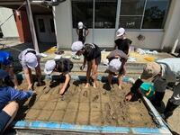 水をはった花壇に恐る恐る素足で入り、田植えに挑戦します。