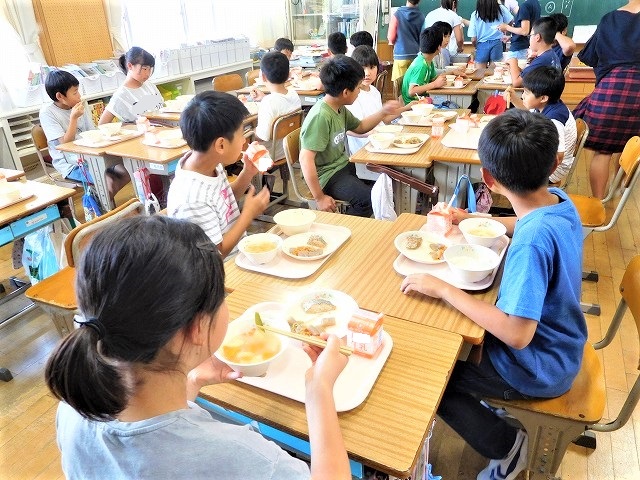 給食の時間に訪問しますと,ランチルームにて給食を頂いている3・4年生の子どもたちへ,給食主任が「牛乳の大切さや役割」を分かりやすく伝えていました。1・2年生の教室へ訪問しますと,「〇〇がおいしいです。」と,子どもたちから声が聞こえてきました。