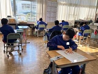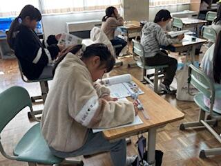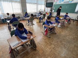 4年生の算数科の授業では、「分数」のテストに挑戦します。これまでに学習した「真分数」「仮分数」「分数の大小」、分母が等しい「たし算」「ひき算」の問題に取り組みます。