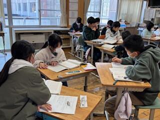 5年生の国語科の授業では、「想像力のスイッチを入れよう」の学習です。それぞれの段落を簡単にまとめ、内容をつかみます。グループで協力しながら取り組んでいます。