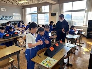 2年生の音楽科の授業では、「おまつりの音楽をつくろう」の学習です。「村まつり」の曲にあわせて、手拍子やおはやしを考えます。つくった音楽をつないで、友だちと一緒に発表します。