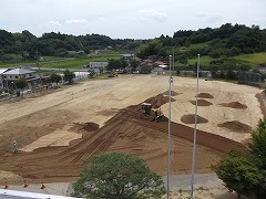 また、校庭の覆土工事も始まりました。今回の工事では、校庭全面に5cm程度の覆土を行う予定になっています。こちらの工事は8月中旬が終了の目安です。