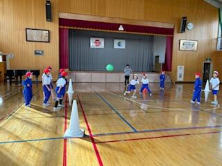 1年生の体育科の授業では、「ボール投げゲーム」の学習です。ソフトバレーボールを使って、紅白に分かれてドッジボールをします。ボールをキャッチして投げる動きがスムーズになってきました。