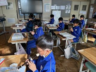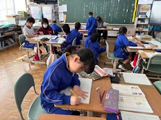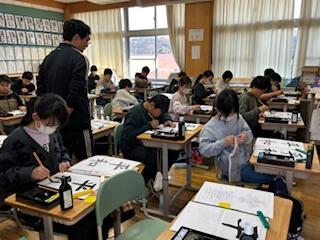 5年生の国語科(書写)の授業では、「書きぞめ」の学習です。「平和な里」を「平和」と「な里」に分けて練習した後、名前を書く位置をバランスよく決め、名前の中心線も意識して練習します。