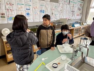 5年生の理科の授業では、「物のとけ方」の学習です。「水の温度によって、物のとけ方は変わるのかな?」お湯の入ったビーカーに食塩やミョウバンを入れて、とけ方を比べます。