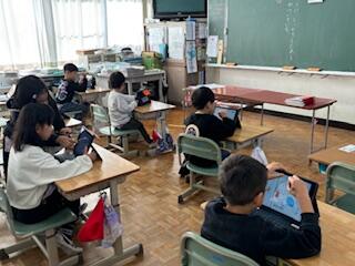 1年生の生活科の授業では、「タブレットの使い方」の学習です。タブレット一斉持ち帰りに合わせて、タブレットの使い方を確認します。タブレットのイラストに色を塗ることも上手にできています。