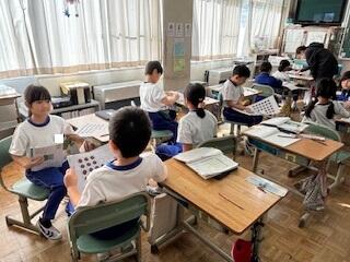 2年生の算数科の授業では、「九九をつくろう」の学習です。「L字型にならんだチョコレートの数を計算でもとめられないかな?」自分の考えを分かりやすく友だちに伝える姿がすばらしいです。