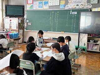 2年生の国語科の授業では、「思いうかべたことをもとに、お話をしょうかいしよう」の学習です。「みきのたからもの」を紹介する文を読み合って、友だちのいいところを発表します。
