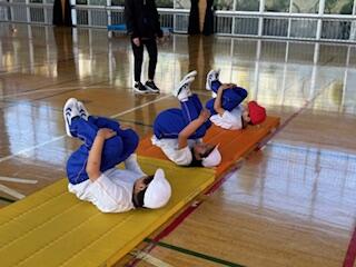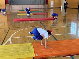 2年生の体育科の授業では、「マットを使った運動遊び」の学習です。「ゆりかご」や「川わたり」の運動をします。説明をよく聞いて、ポイントを押さえながら上手にできています。