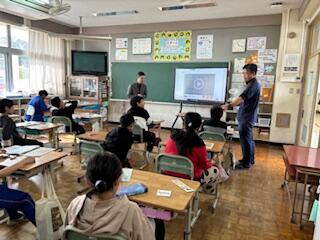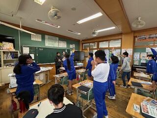 6年生の外国語科の授業では、マシュー先生と「We all live on the Earth.」の学習です。「しまうま」→「zebra」、「バッタ」→「grasshopper」、「象」→「elephant」英語で答えます。