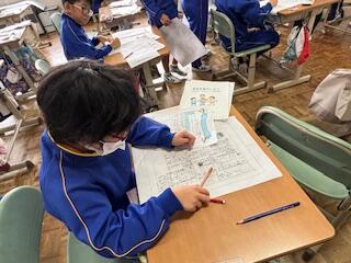 3年生の社会科の授業では、「はたらく人とわたしたちのくらし」の学習です。見学学習でシマダヤとリオンドールを訪問して学んだことについて新聞にまとめ、完成させます。