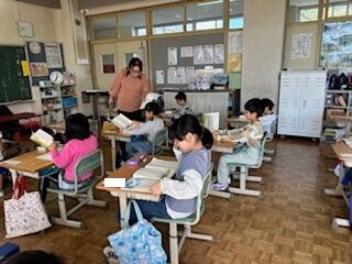 1年生の国語科の授業では、「おもいうかべながらよもう」の学習です。学習発表会でも発表する「くじらぐも」をみんなで音読します。家でも練習している1年生、とても上手です。