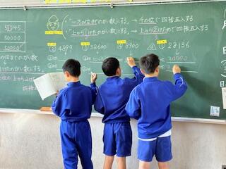 4年生の算数科の授業では、「およその数の表し方と使い方を調べよう」の学習です。「一万の位までのがい数」「上から2けたのがい数」を求めるには?四捨五入の位を考えます。