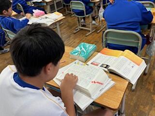 5年生の国語科の授業では、「秋の夕」の学習です。「枕草子」の「秋は夕暮れ ・・・」に出てくる言葉や「望月」「十六夜」「星月夜」などの言葉の意味を辞書で調べます。