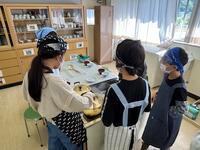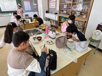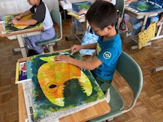 1年生の図画工作科の授業では、「おはなしのえ」の制作です。ローラーを転がして画用紙に色を塗ったり、骨や魚の周りにクレヨンで絵を描いたり、工夫しながら丁寧に作成します。