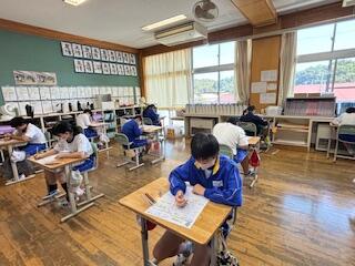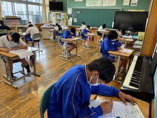 6年生の算数科の授業では、「円の面積の求め方を考えよう」のテストに挑戦します。円の面積の公式を思い出しながら、計算ミスをしないよう集中して筆算をし、円の面積を求めます。