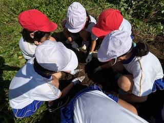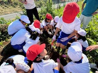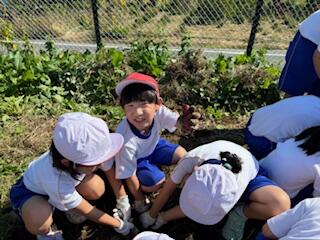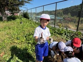 1学期に植えたさつまいもが大きく育ち、今日はみんなでさつまいも掘りです。