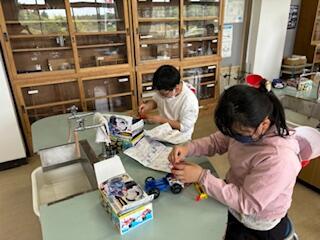 4年生の理科の授業では、「電流のはたらき」の学習です。今日は「電流のはたらき」について学習したことを生かして、設計図を見ながら車を作り、走らせます。