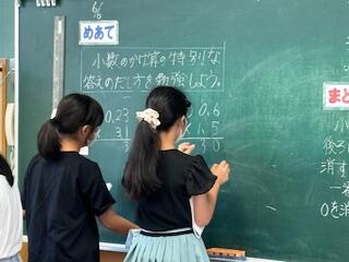 5年生の算数科の授業では、「かけ算の世界を広げよう」の学習です。「2.35×5.6」や「0.23×3.1」のように最後や最初についた「0」はどうすればよいか考えます。