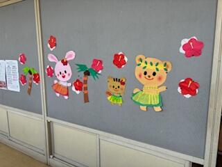 これから満開を迎える「あじさい」と夏を感じさせる「フラダンス」の掲示で、図書室が大変身です。