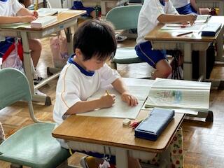 2年生の国語科の授業では、「かん字のたしかめ」の学習です。2年生になって新しく学習した漢字について、「とめ」「はね」「はらい」に注意して丁寧に漢字を書きます。