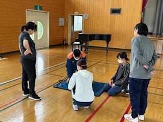 6月12日(水)のプール開き後に水泳の学習が始まりますが、万が一の事故に備えて、心臓マッサージとAEDの使い方について、詳しく教えていただきました。
