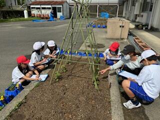 2年生の生活科「野さいのせわをつづけよう」の学習では、先週植えた野菜の種や葉の観察をしました。