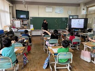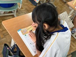 1年生の国語科(書写)の授業では、「『とめ』と『はらい』」の学習です。「く」のとめ、「つ」のはらいを練習します。みんなで書き方を確認してから丁寧に文字を書きます。