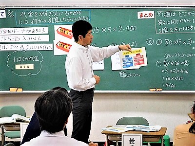 今回は,3年生にとって「3つの数の乗法」は初めての内容でした。特に,「乗法の結合法則」について理解をするねらいとなっていました。学習がスタートしますと,熱心な3年生は各自,考えをしっかりと持ちながらノートに,今までの学習を生かして「3つの数の乗法」を進めていました。その後,各自が考えた方法を伝える場面にて,話し合いを進めることができました。
