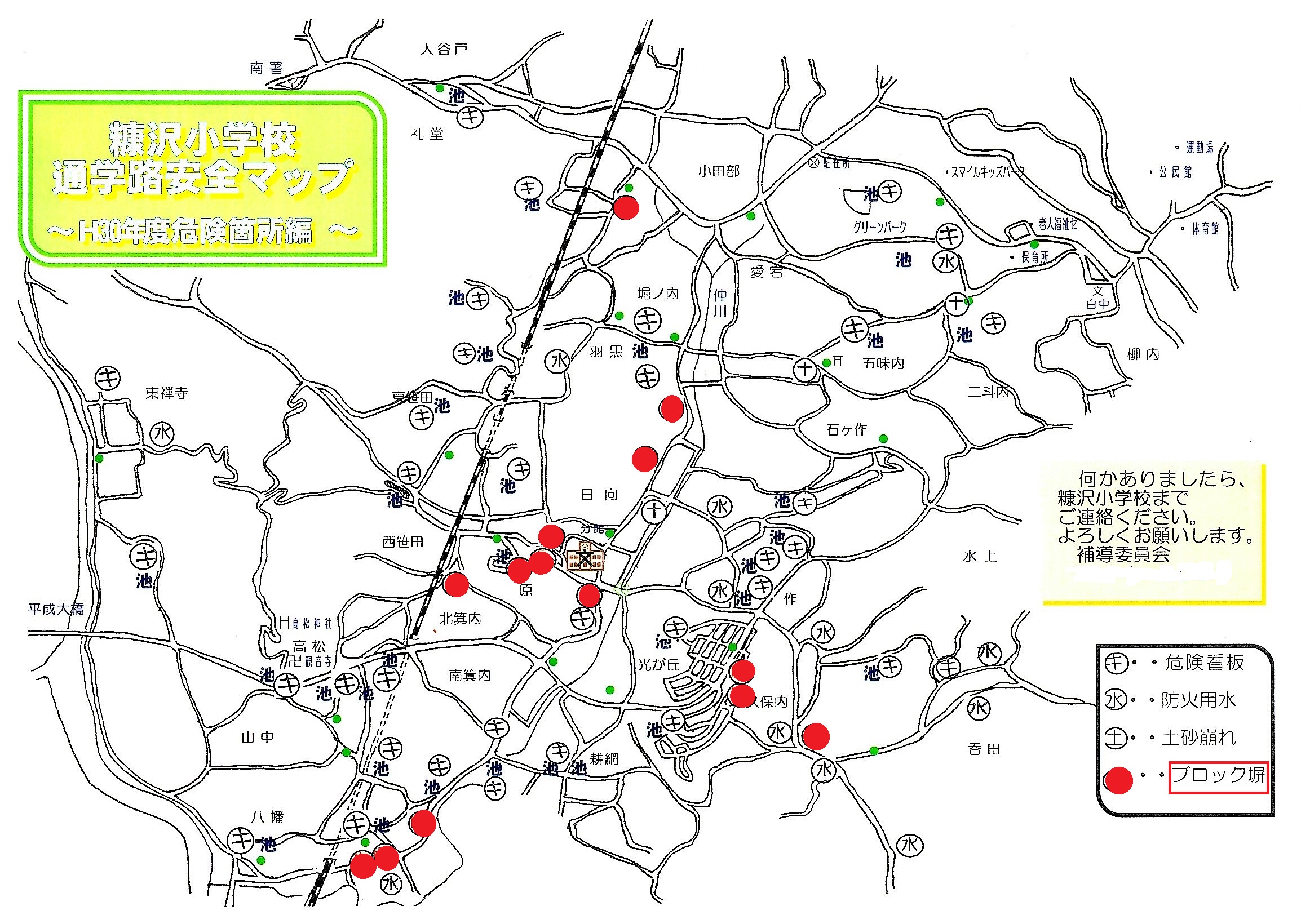 これらの情報を糠沢小学校で活用しています「通学路安全マップ」に掲載することにしました。万が一,同様の事故が発生しないよう十分な安全管理や情報の共有を図って参りたいと存じます。今回,保護者の皆様方とPTA補導委員会の皆様方には,調査等を進めて頂きまして感謝申し上げます。