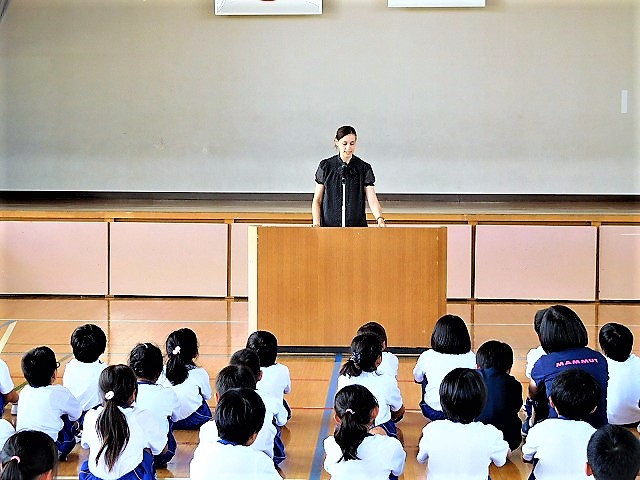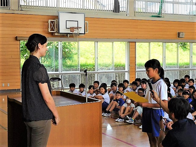 そこで,今までの御礼ということで「全校集会(送別会)」を開催し,ジェナ先生へ感謝のメッセージ(寄せ書きなど)を贈呈しました。6年生が代表として,お礼の言葉を述べました。福島(本宮市)での生活や福島(本宮市)の子どもたちとの触れ合いを忘れずに,新任地でも元気に過ごして頂ければ幸いです。毎回,優しい笑顔で楽しい英語学習を進めて頂き,子どもたちは大変喜んでいました。心より感謝申し上げます。