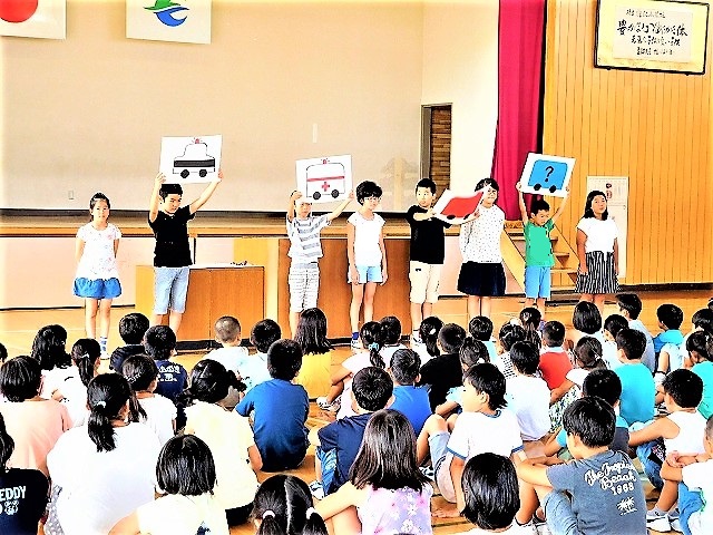 続いて,夏季休業中の「安全な生活」について生徒指導から子どもたちへ発信しました。4つの自動車➡パトカー・救急車・消防車・不審車両