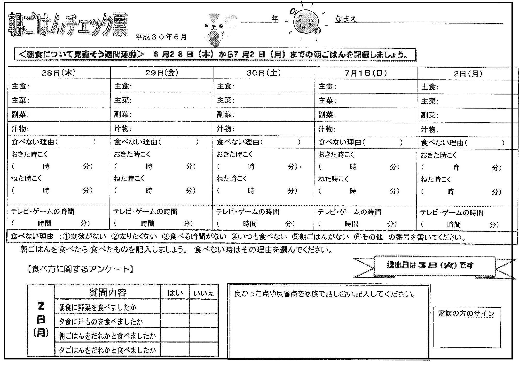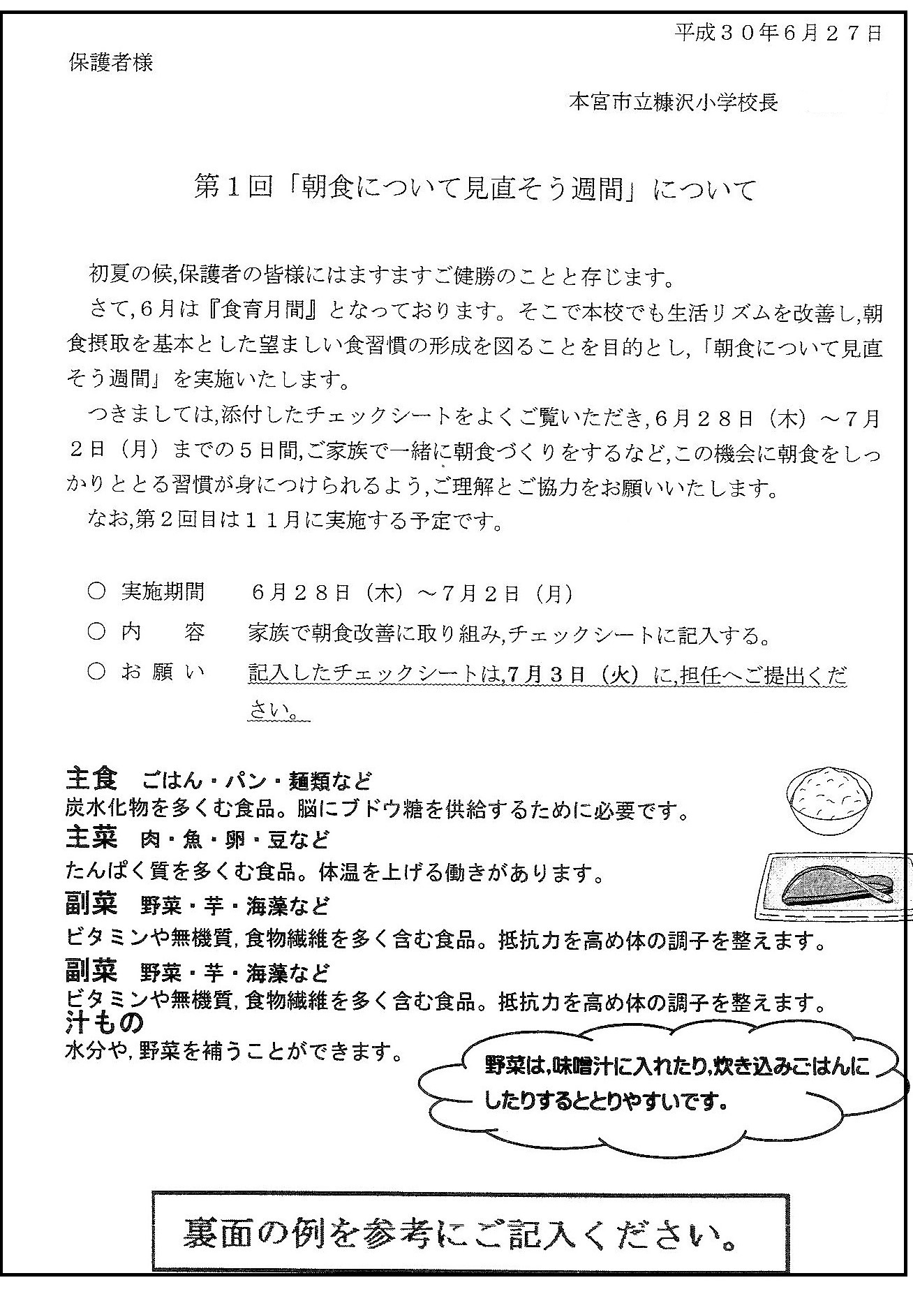 さて,6月も後半となりましたが,「食育月間」に位置づけられています。糠沢小学校でも生活リズムの改善や,朝食摂取を基本とした食習慣の形成が図られるよう「朝食について見直そう週間」を実施しています。このことに関して,6月27日付にて「第1回朝食について見直そう週間」のお知らせを配付いたしました。期間は,6月28日(木)~7月2日(月)までです。ご家族にて「朝食」を話題にして頂ければ幸いです。別紙のような「朝ごはんチェック票」をご案内文書と一緒に配付しましたので,ご理解の上,調査等をお願い申し上げます。