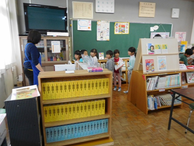 今回,糠沢小学校では,図書館教育の一環としまして,1年生の子どもたちに,「図書館の活用や図書の楽しさ」などを伝えました。まず,読みたい図書を探し,カードと図書を受付へ持参します。受付にて「ピッ!」と,パソコンにて認証します。その後,図書の返却を練習しました。1年生の子どもたちにとっては,初めての体験でした。どの子も,司書の先生からの説明で,図書館から借りる活動・返却する活動が,最後までできました。そして,各自1冊ずつ今回読んでみたい本を借りました。