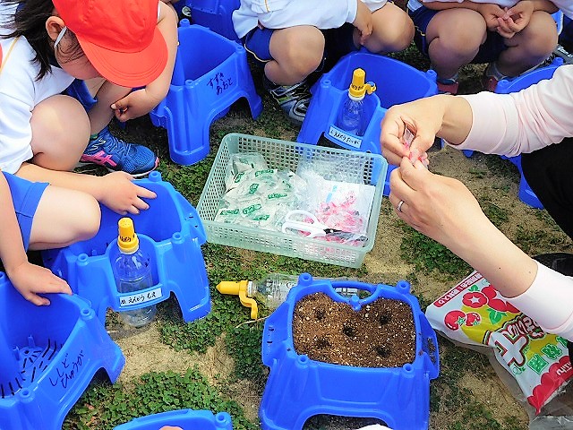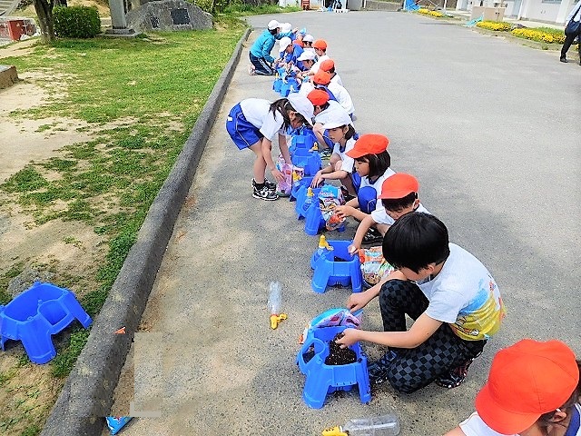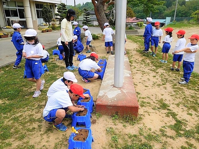 小学校では「生活科」の学習にて,植物の世話・観察を通して「自然と人間とのかかわり」や「いのち」を学びます。植物の世話や成長過程を通して,植物の「特徴」を直接,世話をしたり観察をしたりします。活動を通して,植物の「いのち」を「実感」します。「種まき・水くれ・観察・記録・世話・種取り・・」など,多くの活動を通して「自然の素晴らしさ」や「思いやりの心」の育みに触れます。1年生は「アサガオ」,2年生は「ミニトマト」を栽培します。今後,どのように成長していくのか楽しみです。
