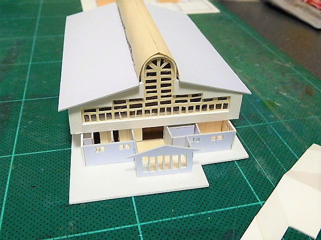 〇校舎,体育館,西側校舎の3棟に関わる第1段階(厚紙等で建物を製作)が終了しました。体育館は,屋根を着色しました。