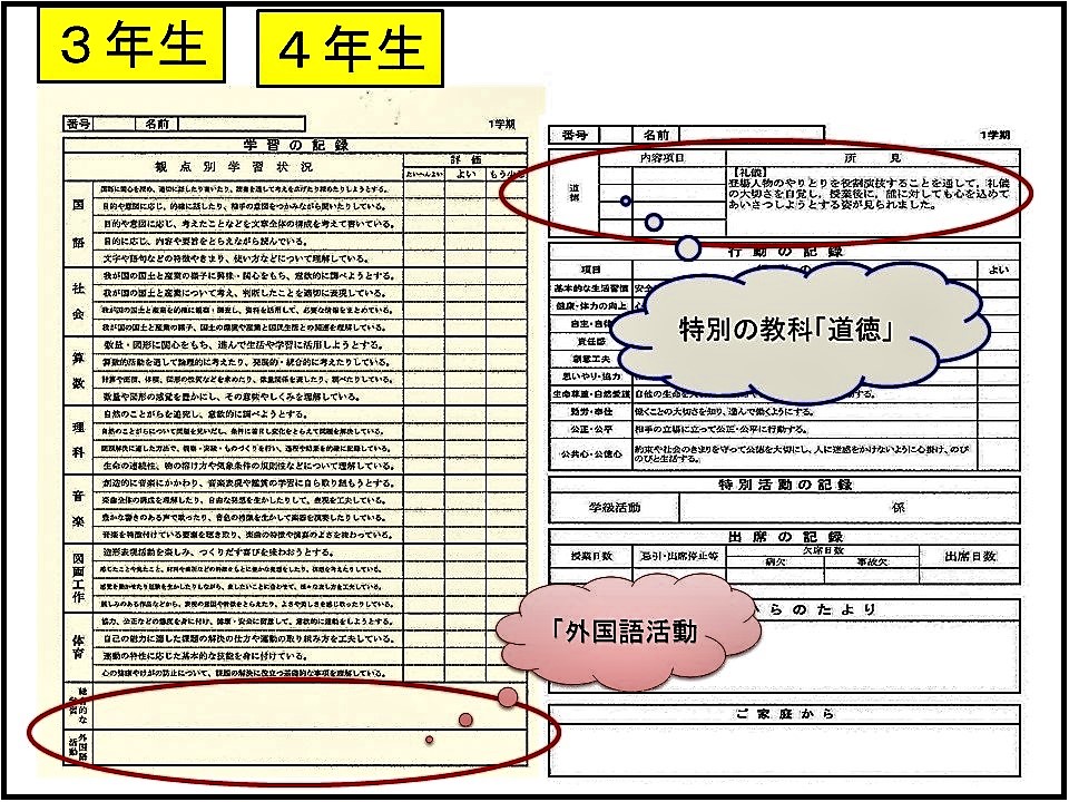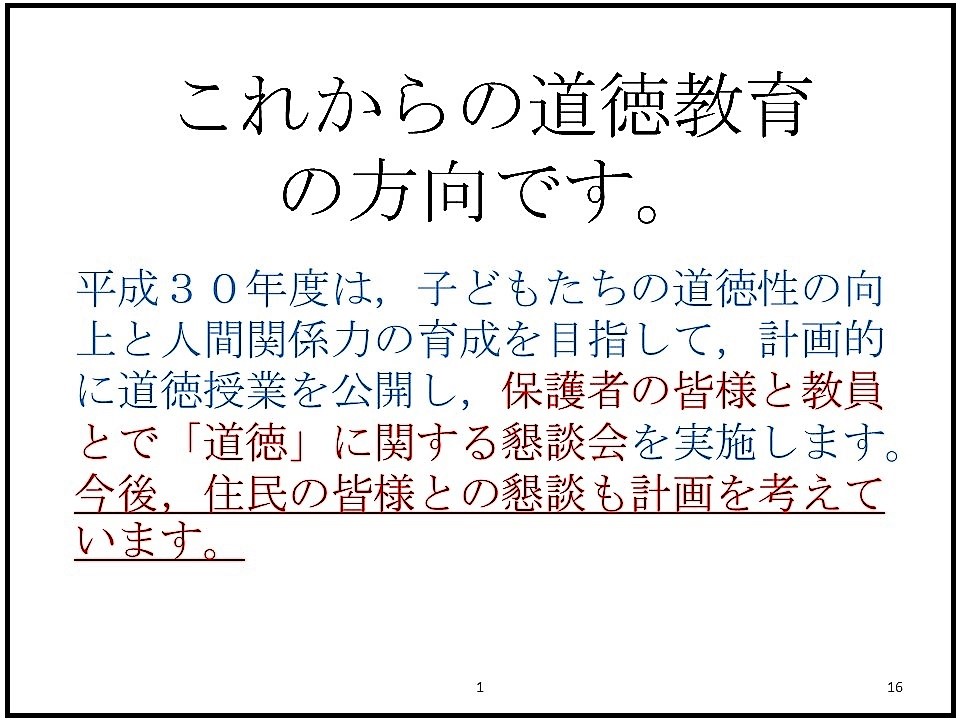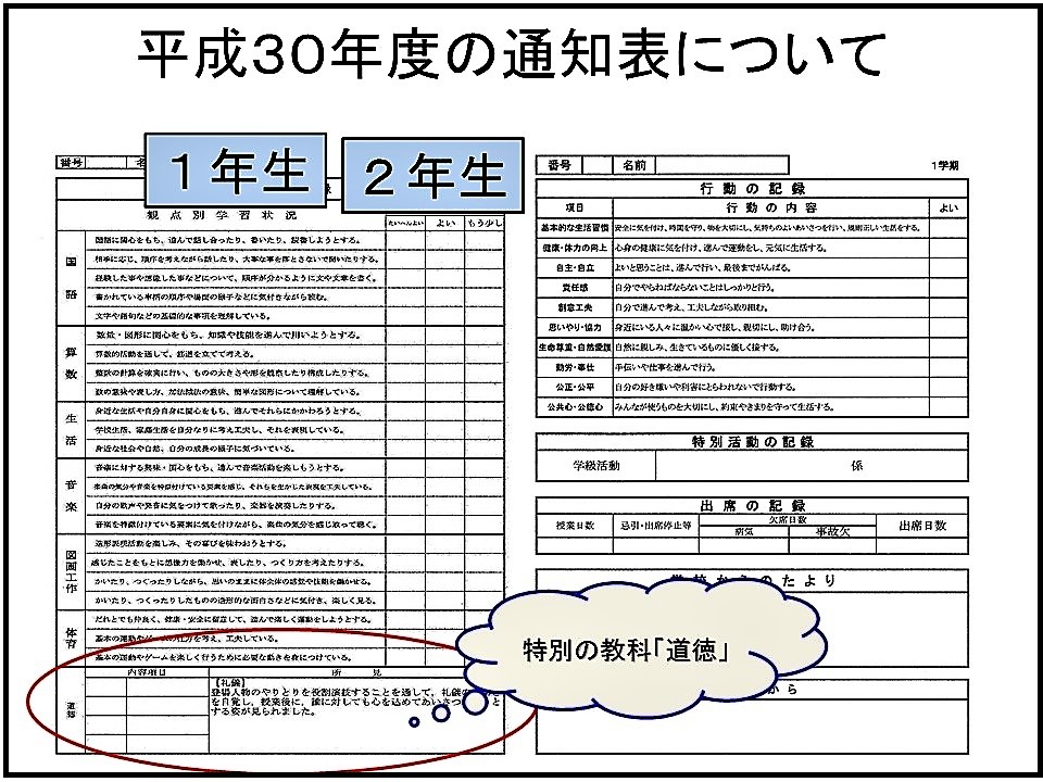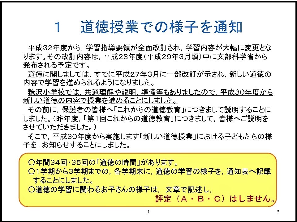 を行う予定です。内容は,「特別の教科」としての「道徳」に関する評価や通知票につきまして,ご説明いたします。